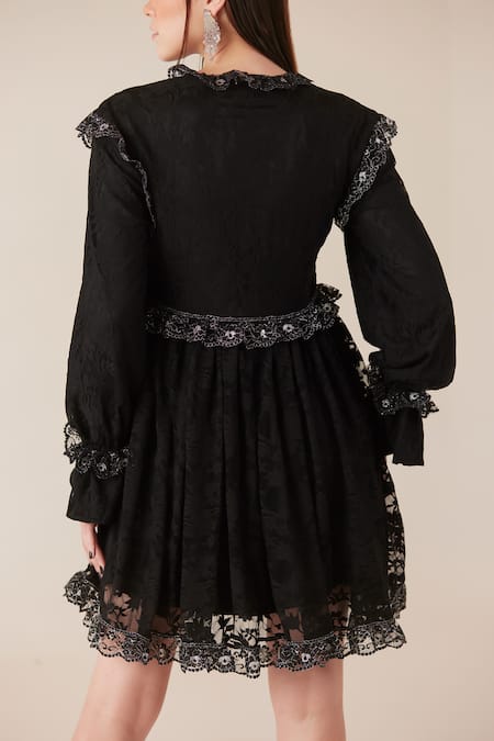 Black Viscose Lace Embroidered Floral Tie-up Neck Work Short Dress