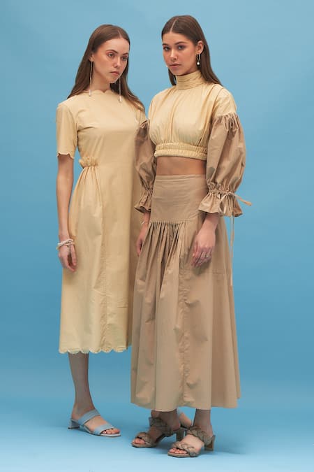 Beige A-line, asymmetrical skirt in cotton base with knife pleat details.