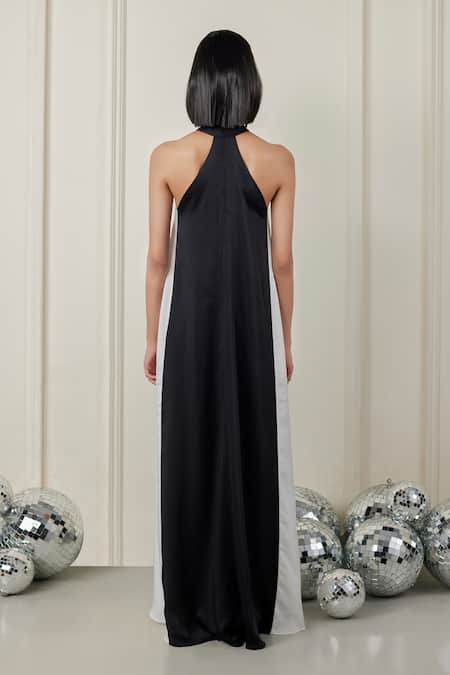 Black and white colorblock maxi dress featuring a halter neckline and sleeveless design