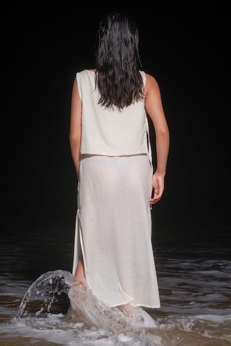 Creamy white woollen layered blouse with side tie-up details. Comes with skirt with side slit.
