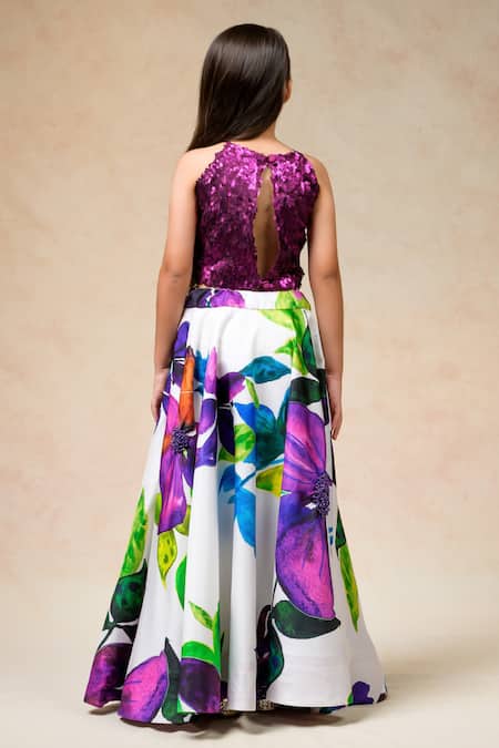 Purple lehenga featuring a blossom print in vibrant colors. Paired with a sleeveless halter neck blouse adorned with tonal sequins and a pure silk organza dupatta.