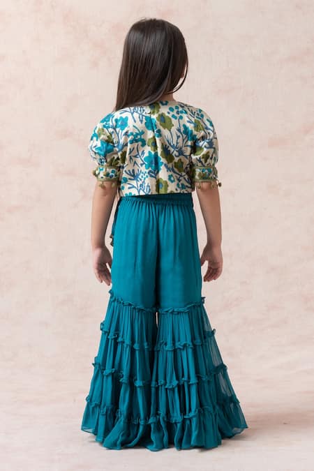 Teal blue and green blouse featuring floral motifs with puff sleeves and pom pom details. Paired with a flared tiered gharara and matching dupatta, both adorned with pom pom borders.