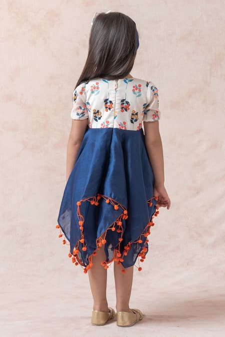 Navy blue dress featuring floral print and sequin work on the bodice. Paired with a matching hair band and designed with a handkerchief hem adorned with contrast pom poms.