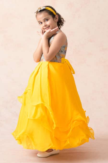 Yellow gown featuring a floral printed yoke with embellishments and a flared skirt. Comes with a matching hair band.