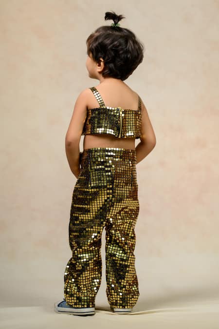 Gold Polyester, Silk Sequins Metallic Chip Embellished Tube Top Pant Set