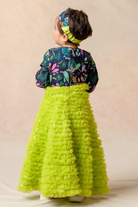 Blue Net, Silk Ruffles, Mystic Jungle Print Gown With Matching Headband