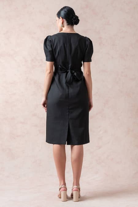 Black Polyester Square Neck Puff Sleeve Midi Dress