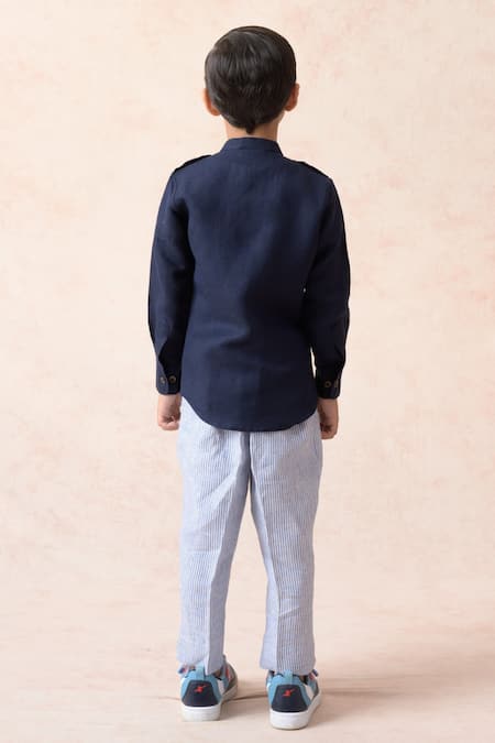 Navy blue shirt featuring sequin embroidered flap pockets and a band collar. Paired with straight stripe pattern pants.