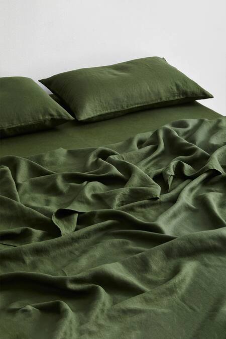 Olive green pure linen bedsheet with miltered corner finishing. Comes with matching two pillow cases.