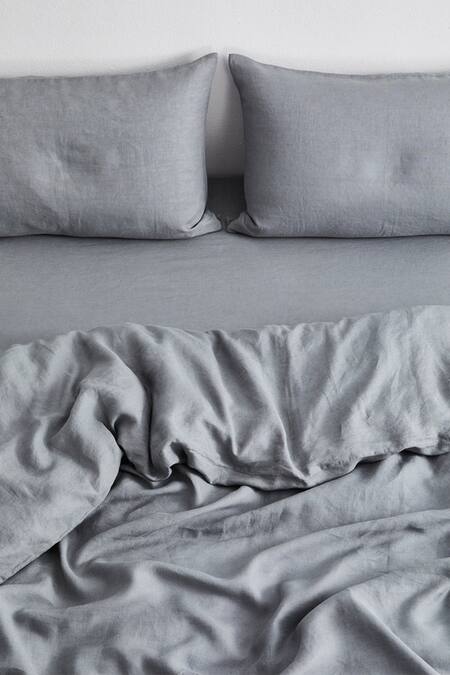Steel grey pure linen fitted bedsheet with miltered corner finishing. Comes with matching two pillow cases.