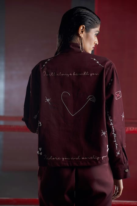 Buy_Pocketful Of Cherrie_Purple Cotton Embroidery Mandarin Collar Hand Bomber Jacket And Jogger Set_at_Aza_Fashions