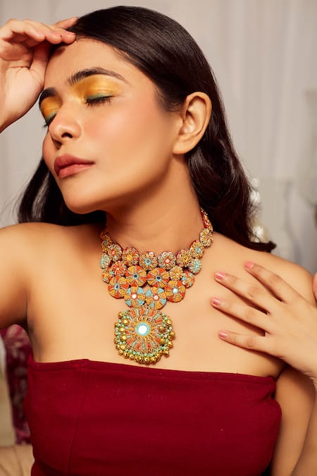 Multicolor choker featuring thread, dabka, tikki, abla, chid & ghungroo embroidery