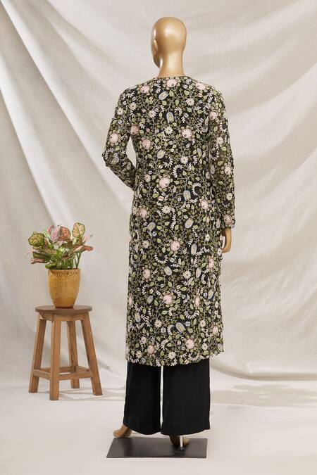 Black straight kurta with multi-color floral motif thread work. Comes with plain pants & cutwork border dupatta.
