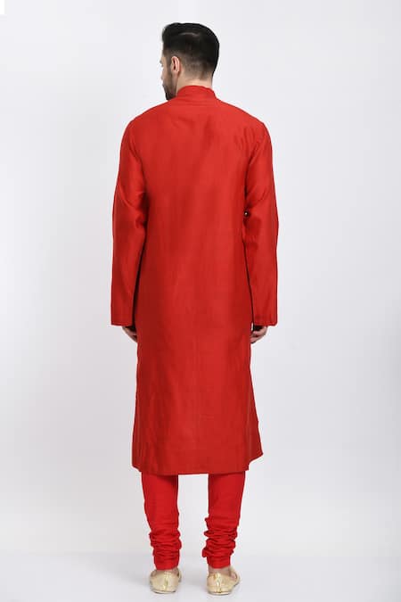 Red kurta featuring intricate thread embroidery and a mandarin collar. Paired with a churidar for a complete look.