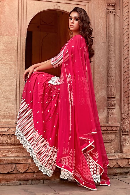 Red Cotton, Net Embroidery, Lace, Mirrors Round Neck Thread Kurta Sharara Set