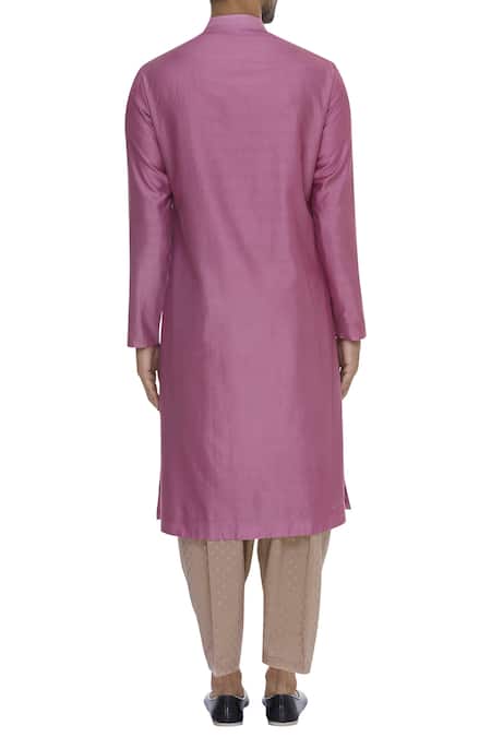 Rose pink chanderi kurta that is enhanced with thread embroidery all over. It is teamed up with gold pyjama.