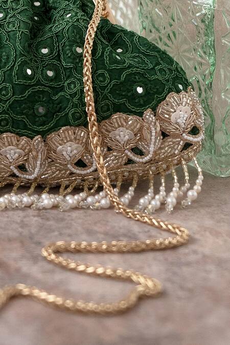 Green clutch featuring all-over tonal thread embroidery with mirror detailing