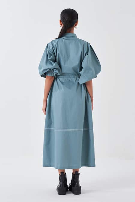Blue Poplin Collared Puffed Sleeve Shirt Dress