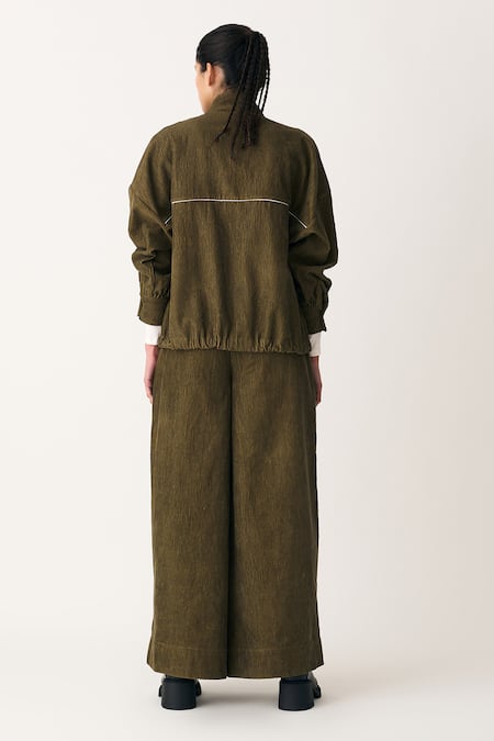 Green Corduroy High Neck Drawstring Top And Trouser Set