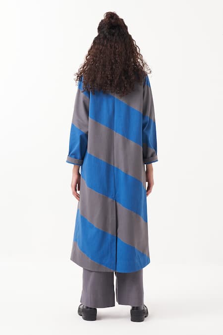 Electric blue and grey jacket featuring a wide lapel collar with diagonal striped applique
