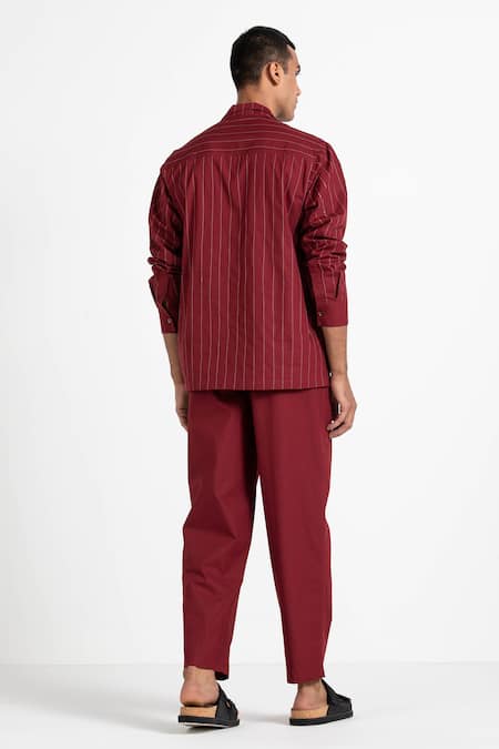 Crimson red shirt with all-over linear embroidery, notch collar, patch pockets and full sleeves. Comes with solid pant.