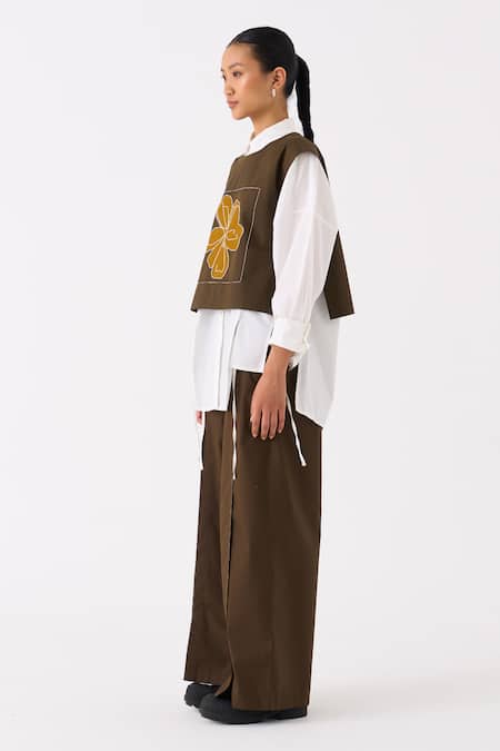 White panelled shirt featuring fringe details and a collared neckline. Paired with a dark olive green overlay showcasing a floral motif in the center.