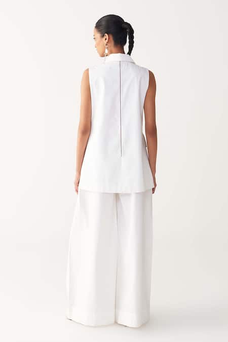 White floral patch fringe waistcoat featuring floral applique detail and a relaxed fit. Paired with an inverted box pleat pant that includes side inseam pockets and an inverted pleat detail.