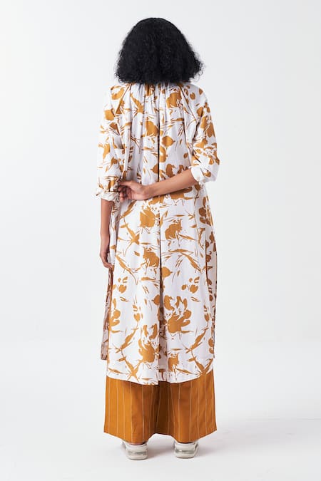 White kurta featuring a gathered neckline and floral print, complemented by three-fourth sleeves. Paired with a stitchline embroidered palazzo in yellow.