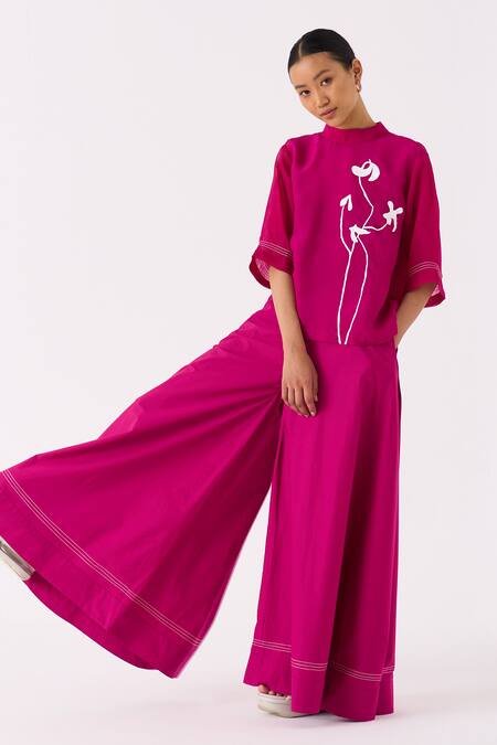 Fuchsia top featuring a round collar and three quarter sleeves with a contrast floral print. Paired with wide legged pants made from poplin fabric.