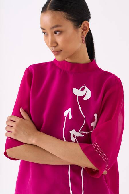 Fuchsia top featuring a round collar and three-quarter sleeves with a floral print