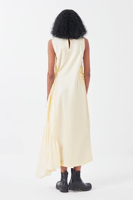 Yellow Poplin Round Neck Frilly Bloom Applique Midi Dress