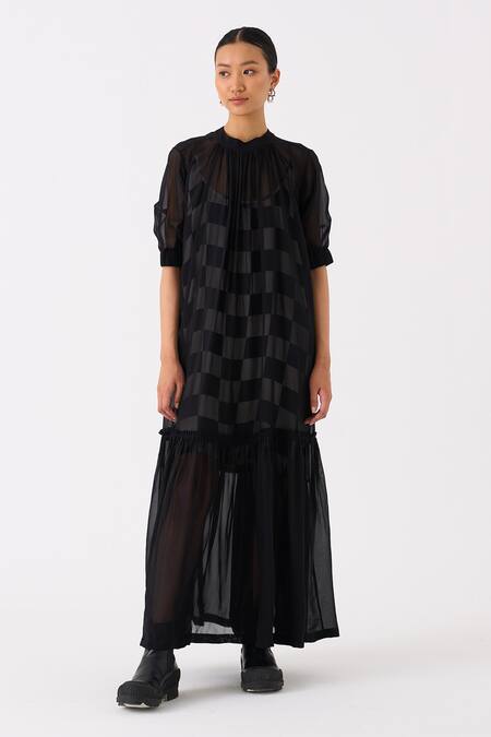 Black Organza Print Checkered High Neck Frilly Hem Sheer Dress With Slip