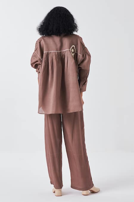 Brown shirt featuring full sleeves with fringed motif applique and pintucked yoke detailing