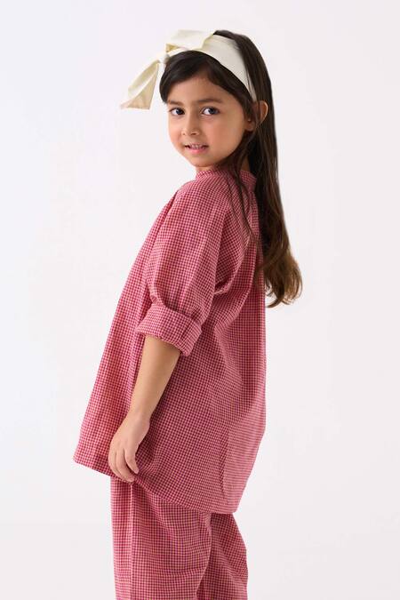 Pink Mul Printed Checks Gathered Neck Pattern Shirt