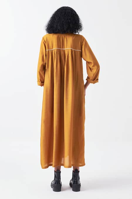 Yellow Bamboo Round Neck Gathered Neckline Midi Dress