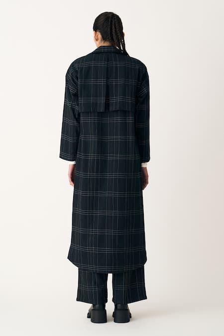 Black Cotton Embroidery Collared Grid Pattern Jacket And Trouser Set