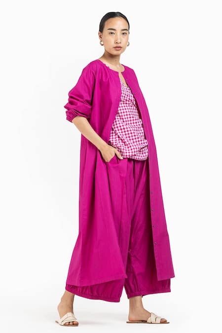 Hot pink sleeveless top with checkered motifs & side tie-up.