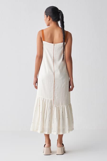 Ivory dress featuring a square neckline, sleeveless design, and gathered hem