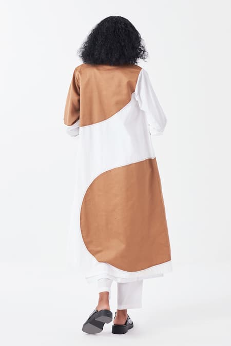 White long jacket featuring brown rolled up sleeves and applique detailing