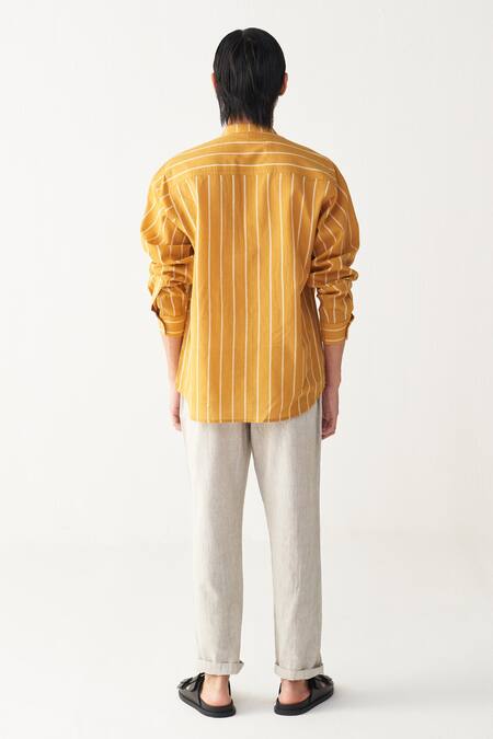 Mustard Handloom Cotton Yellow Stripe Shirt And Pant Set