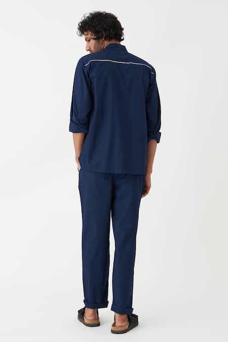 Blue Poplin Piping Plain Collared Shirt