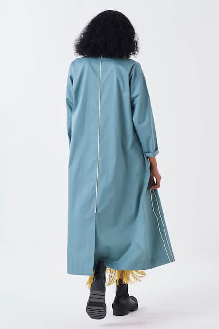 Blue long jacket featuring poppy applique detailing and paired with a butter yellow dress with fringed border. The dress has a relaxed fit and is complemented by the jacket's three-fourth sleeves and lapel collar.