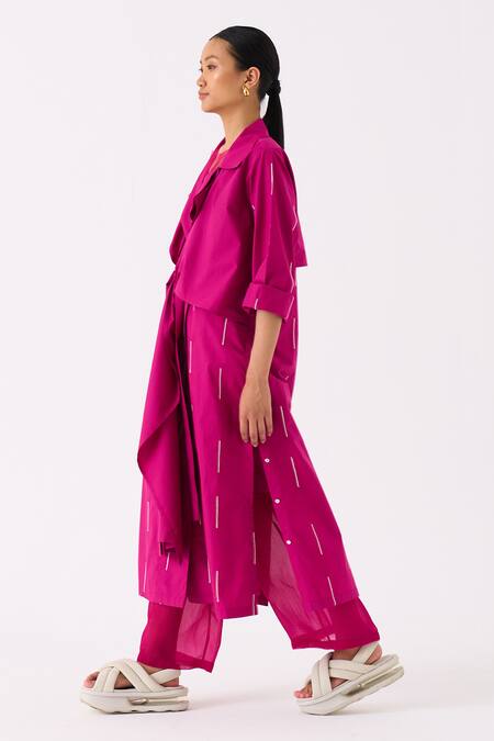 Fuchsia pink crop jacket featuring rolled up sleeves and a Cuban collar