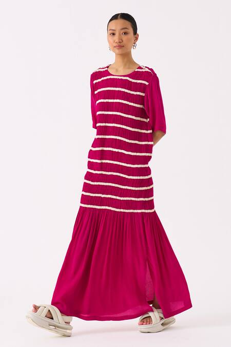 Fuchsia pink maxi dress featuring elbow sleeves and a round neckline