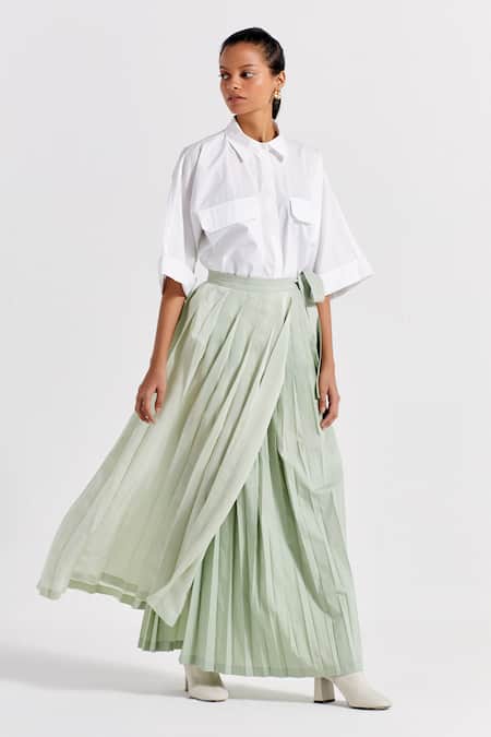 White shirt featuring a collar and patch pockets. Paired with a mint asymmetric pleated maxi skirt with a side tie-up.