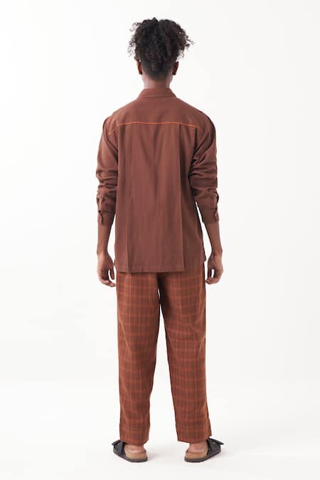 Brown solid shirt featuring a shirt collar and double patch pockets. Paired with checkered front pleated pants that include side inseam pockets.