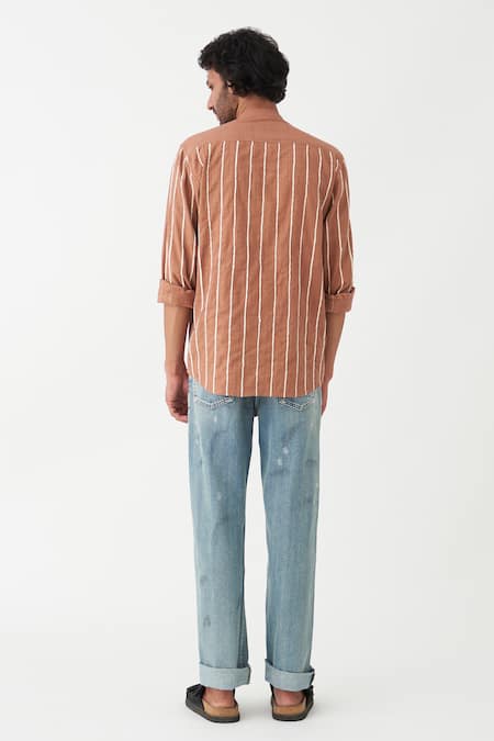 Beige Handloom Cotton Striped Print Roll-up Sleeve Shirt