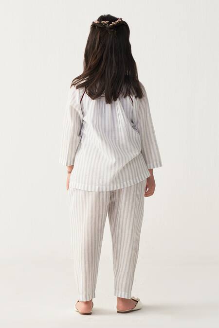 White and blue gathered neck shirt featuring a loose fit and front placket opening