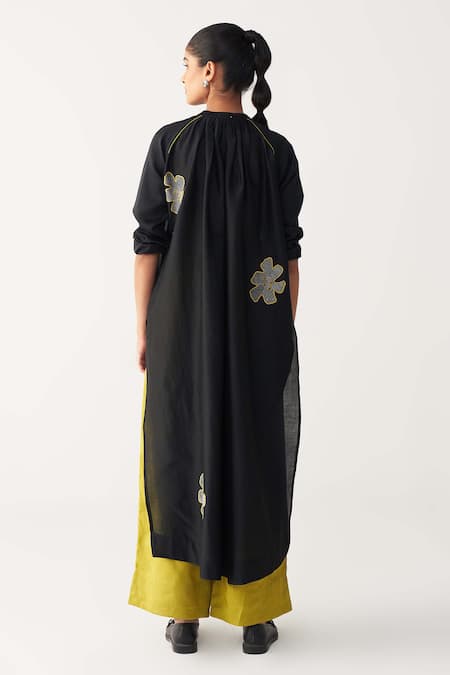 Black Chanderi floral embroidered gather neck shirt tunic featuring side slits