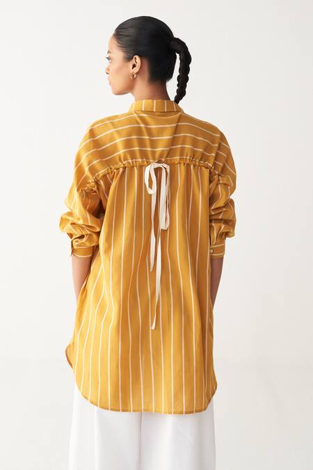 Mustard yellow striped shirt featuring a drawstring detail on the back
